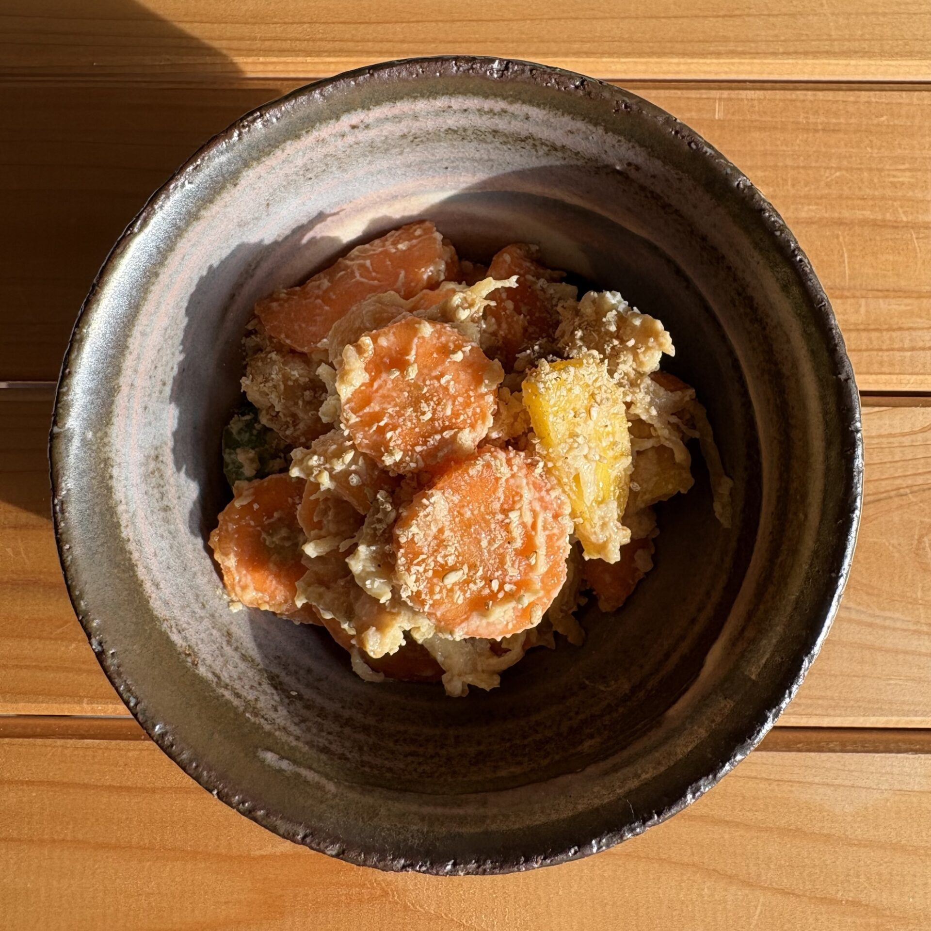 人参と酒粕を混ぜ合わせる。ジップロックなどで揉み込むと簡単だと思いますが、私は最初は手で揉み込み、スプーンや箸なども使って、どんぶりの中で混ぜました。